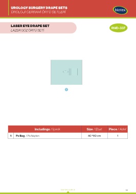 UROLOGY SURGERY DRAPE SETS ÜROLOJİ CERRAHİ ÖRTÜ SETLERİ LASER EYE DRAPE SET RMD-337 LAZER GÖZ ÖRTÜ SETİ 1 Includings / İçerik Size / Ebat Piece / Adet 1 Pe Bag / Pe Naylon 40 *60 cm 1 bio-tex.com.tr 39